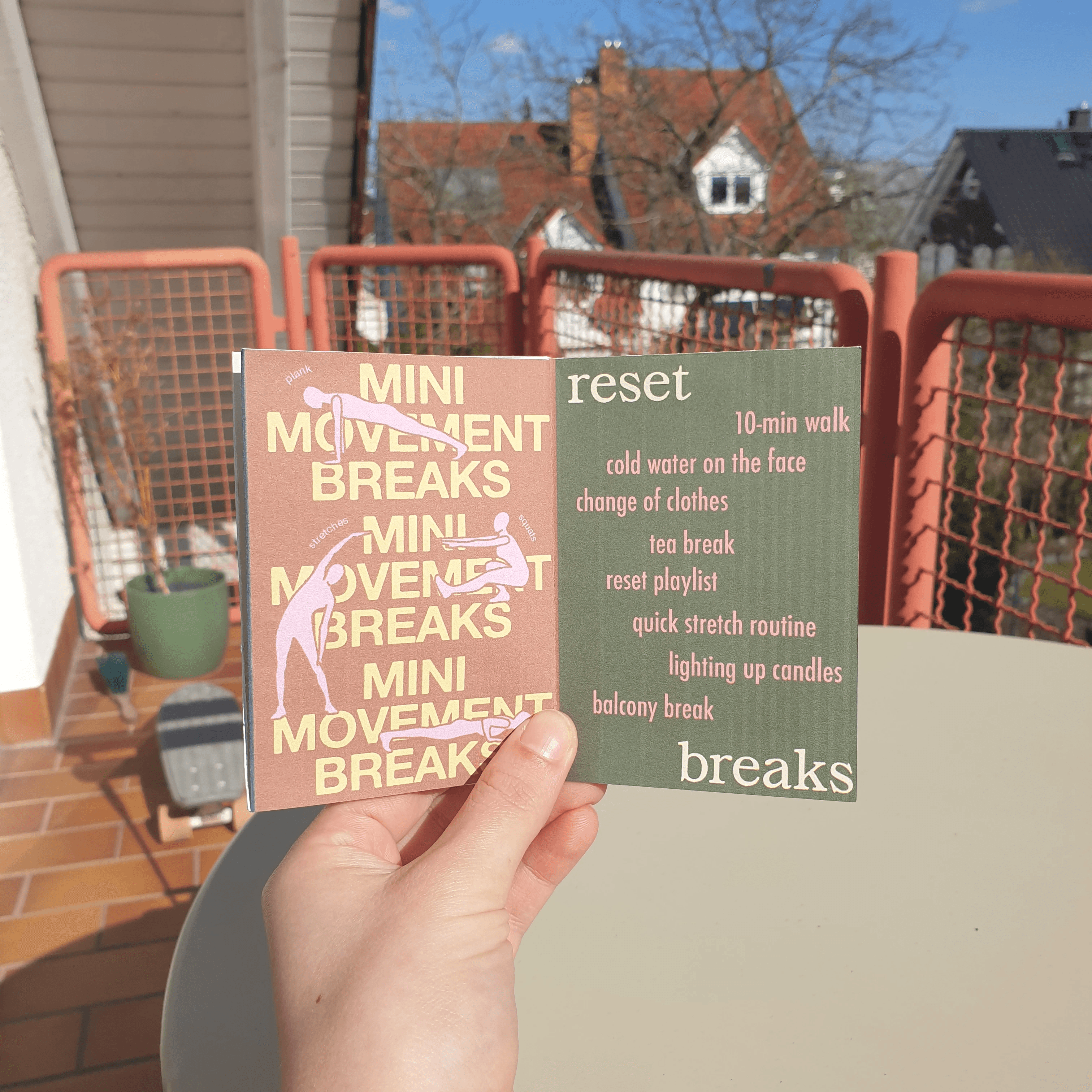I also included "out of routine" options, to take conscious pauses throughout the day, so I included the pages "Mini movement breaks" and "reset breaks" for that reason.